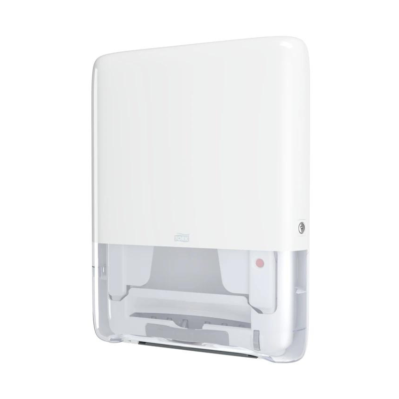 Mini Distributeur Tork PeakServe blanc pour Essuie-mains continus. Le système possède une capacité très élevée de plus de 1 230 essuie-mains, qui peuvent être distribués rapidement et sans interruption pour maintenir une circulation fluide.